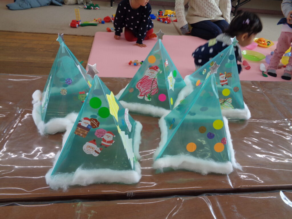シール台紙にお絵描きをし、保護者の方にサンタさんやツリーの型抜きをしてもらい、クリアファイルで作ったツリーに貼り付けました♪最後は綿の雪を貼り付けて完成!!こどもたちは「ゆき」という響きに目がキラキラ☆感触を楽しみながら貼り付けていました♪