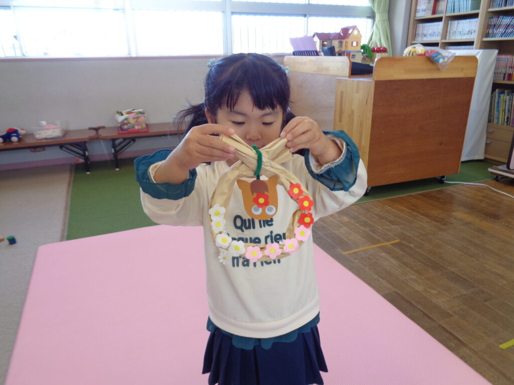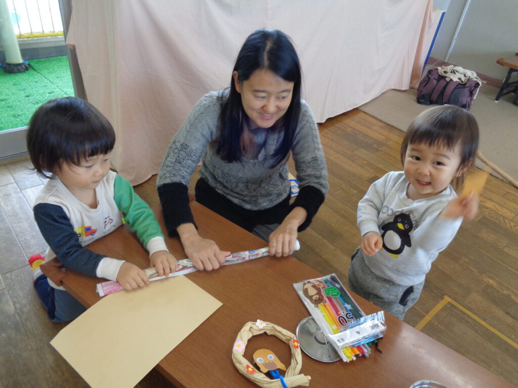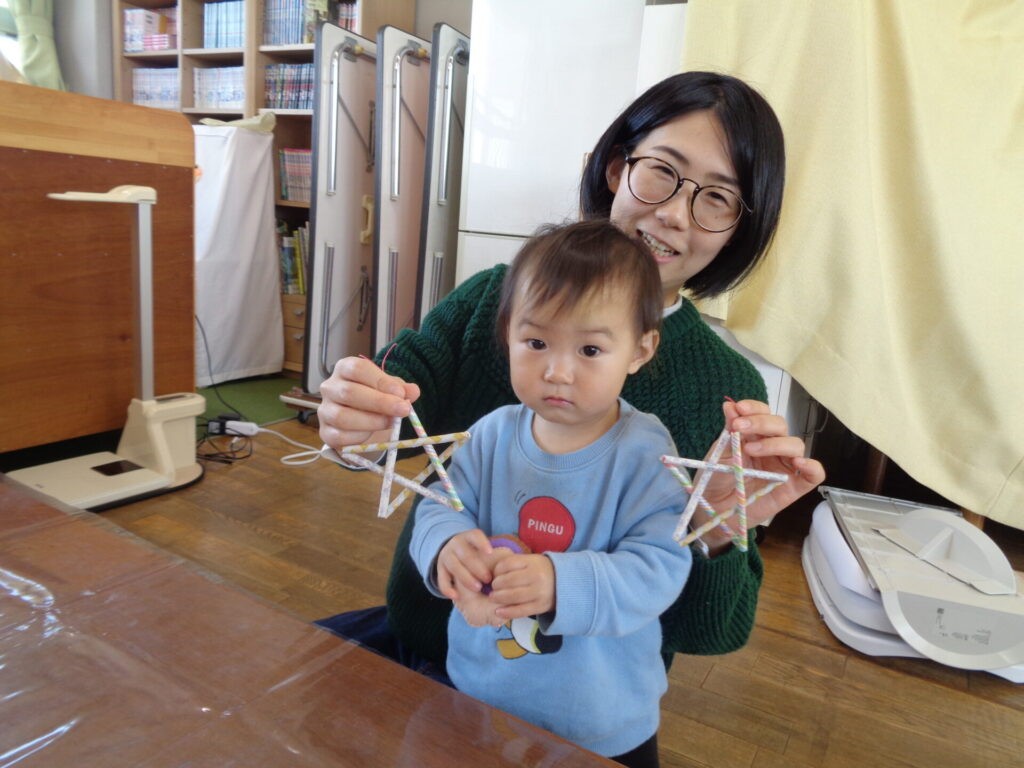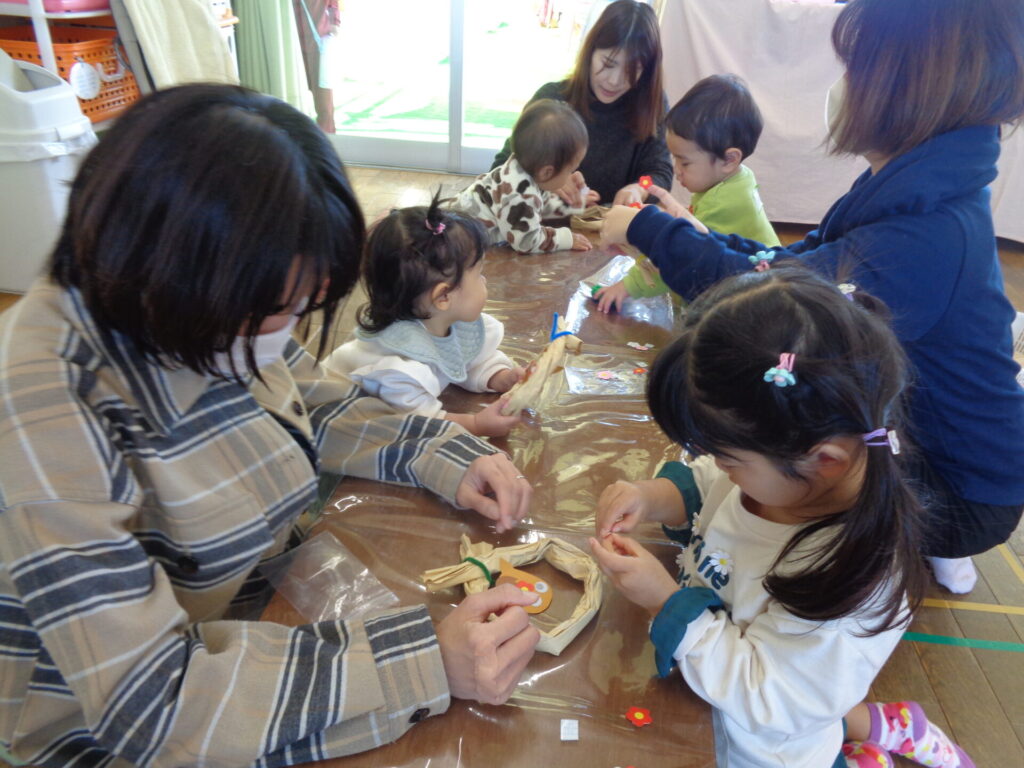 来年は「うまどし」ですね!馬の目をシールで貼って顔を作ったり、リースにお花のシールを貼ってかわいいしめ縄が出来上がりました♪お花のシールは両面テープをはがして貼るのですが小さいお友達も頑張ってはずしていましたよ☆ぜひ、お家にも飾ってもらって来年もみなさんが健康で笑顔あふれる一年になりますように☆