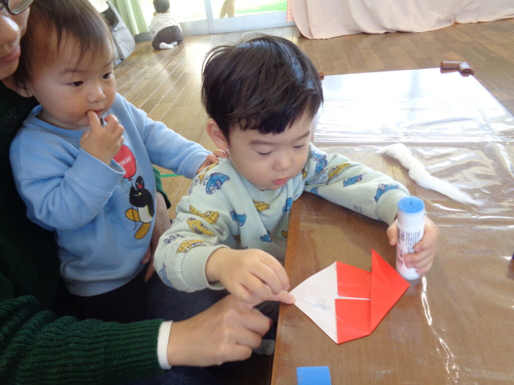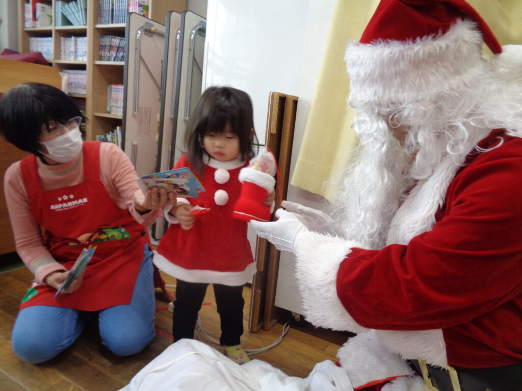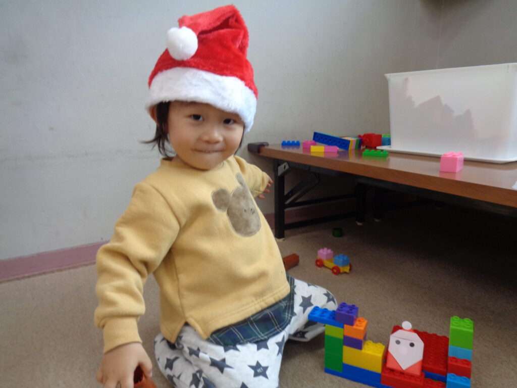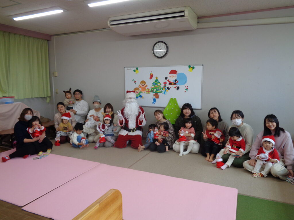折り紙でママたちにサンタさんの指人形を作ってもらったり、音楽に合わせて楽器遊びをしたりクリスマスを楽しみました♪最後はお待ちかねサンタさんの登場でみんな緊張!固まってプレゼントもいらないという子もいたり、プレゼントはしっかり受け取る子もいたりと様々でした!また来年も是非、サンタさんに会いに来てくださいね♪