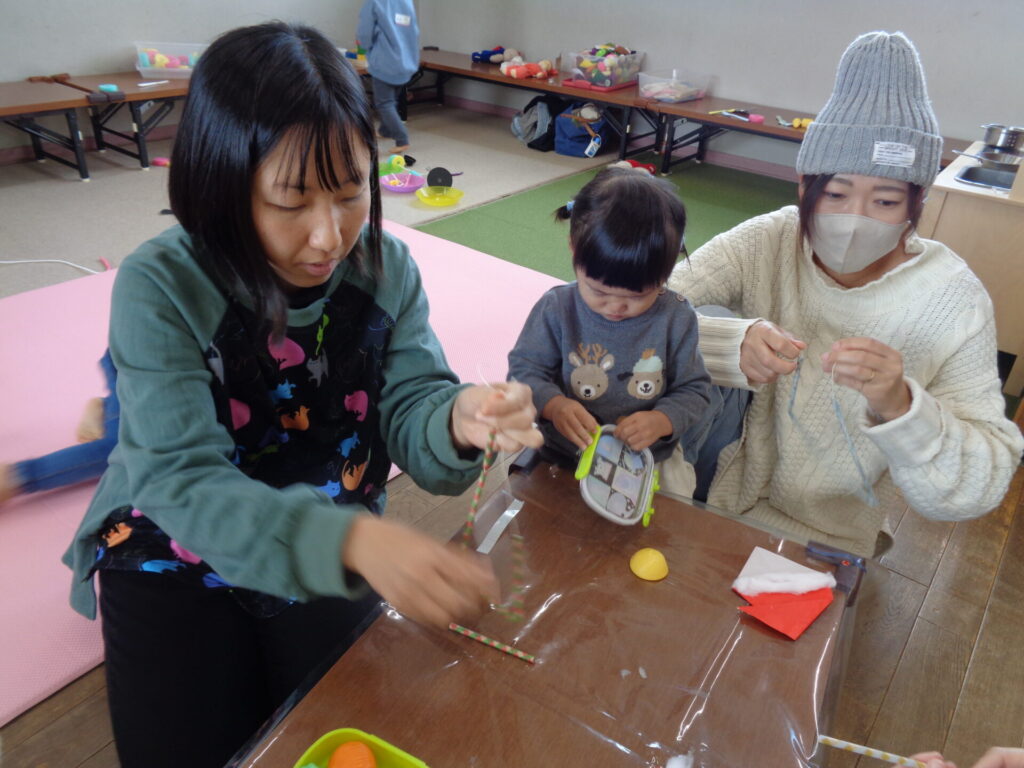 ストローの紐通しは難しいかな?と思いましたが、集中力が凄く熱心に紐通しを頑張っていました☆
