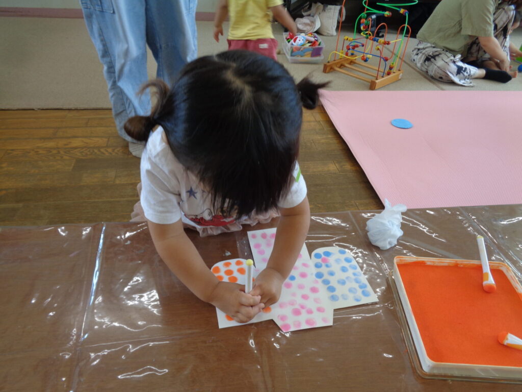 たんぽを使ってゆかたに模様をつけていきます♪