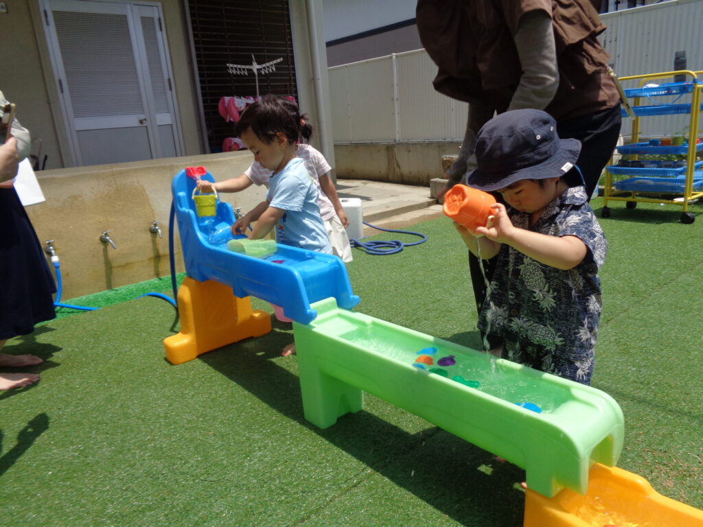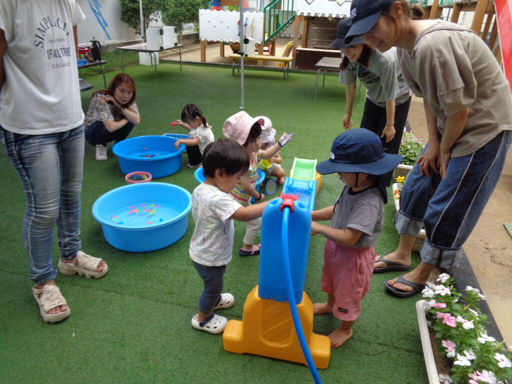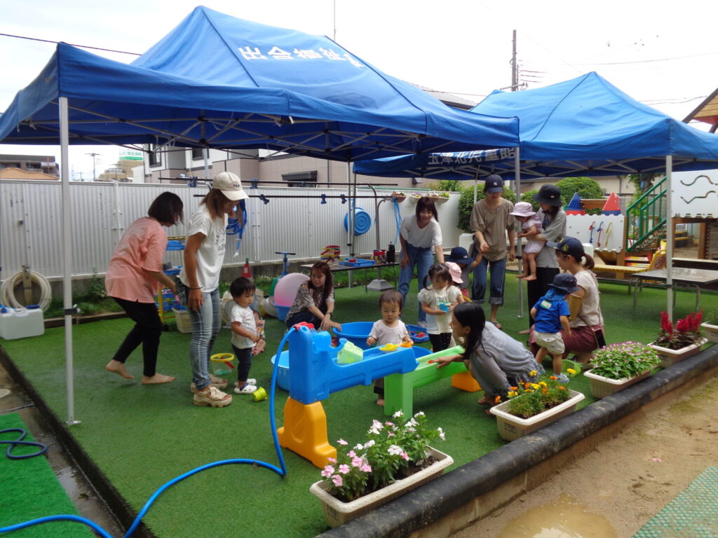 昨年度好評だった水遊び。今年は3日間水遊びを予定していましたが、雨で2日間となりましたが、たくさんのお友達が来てくれて、思い切り水遊びができて喜んでもらえてうれしかったです♪