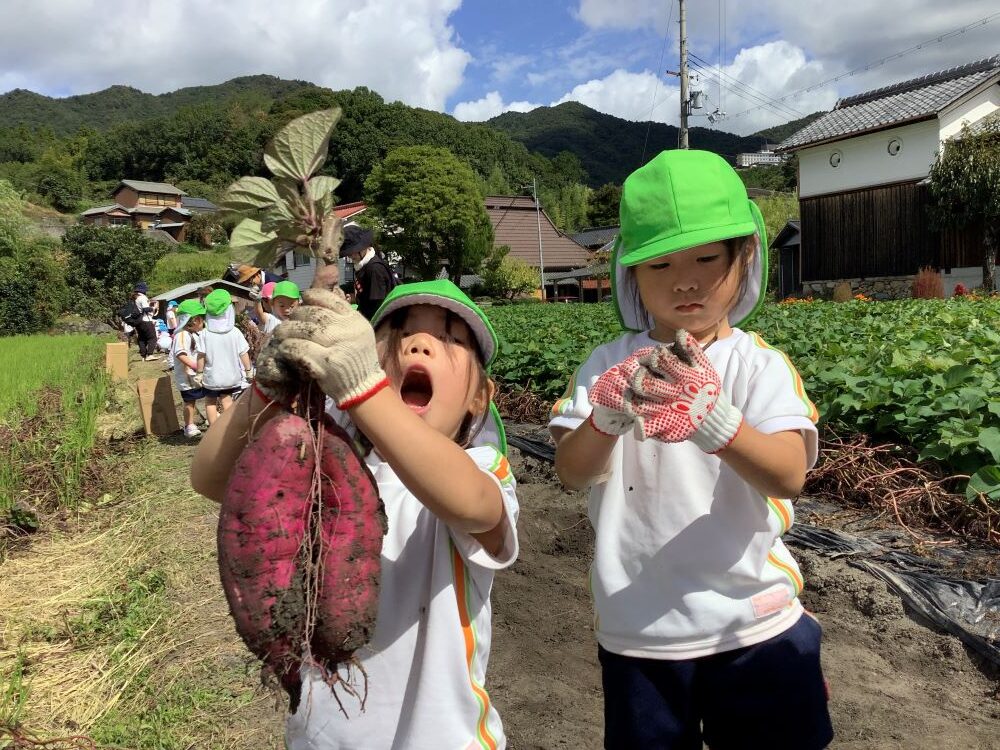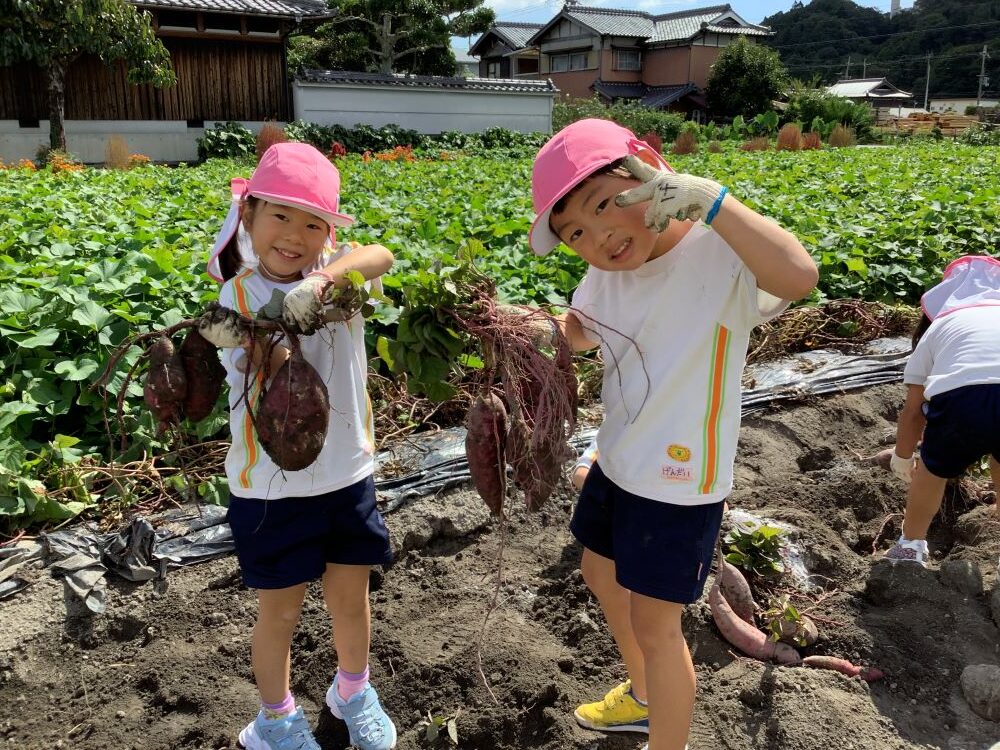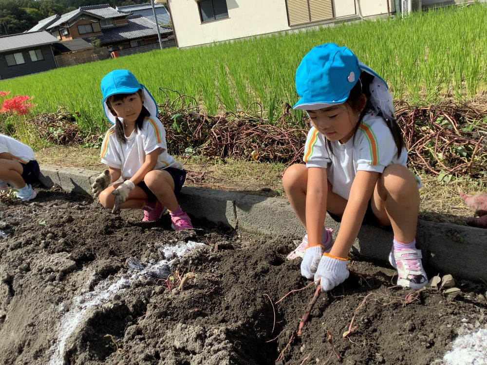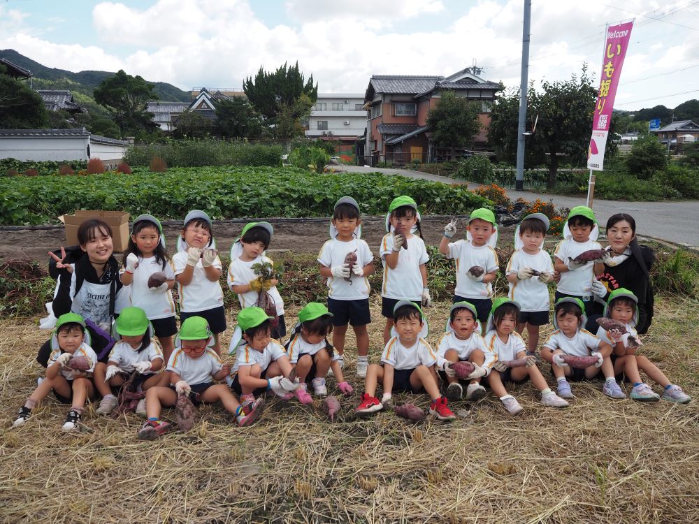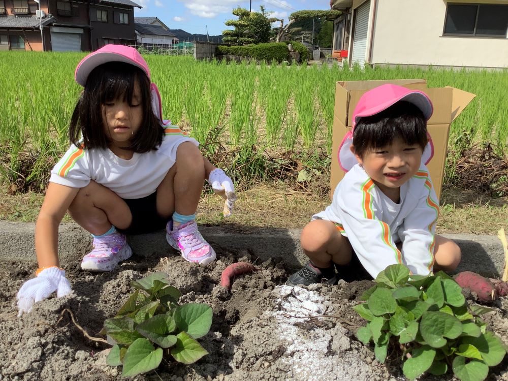 3~5歳児でいもほりに行きました。今年は天気にも恵まれ、大きなおいもがたくさん取れました!初めは土を掘ることなど難しかったのですが、土の中から少し見えると「おいもあった!」とやる気を出して頑張って掘っていた子どもたちでした。取ったおいもはみんなで分けて持ち帰ったり、給食で食べました。
