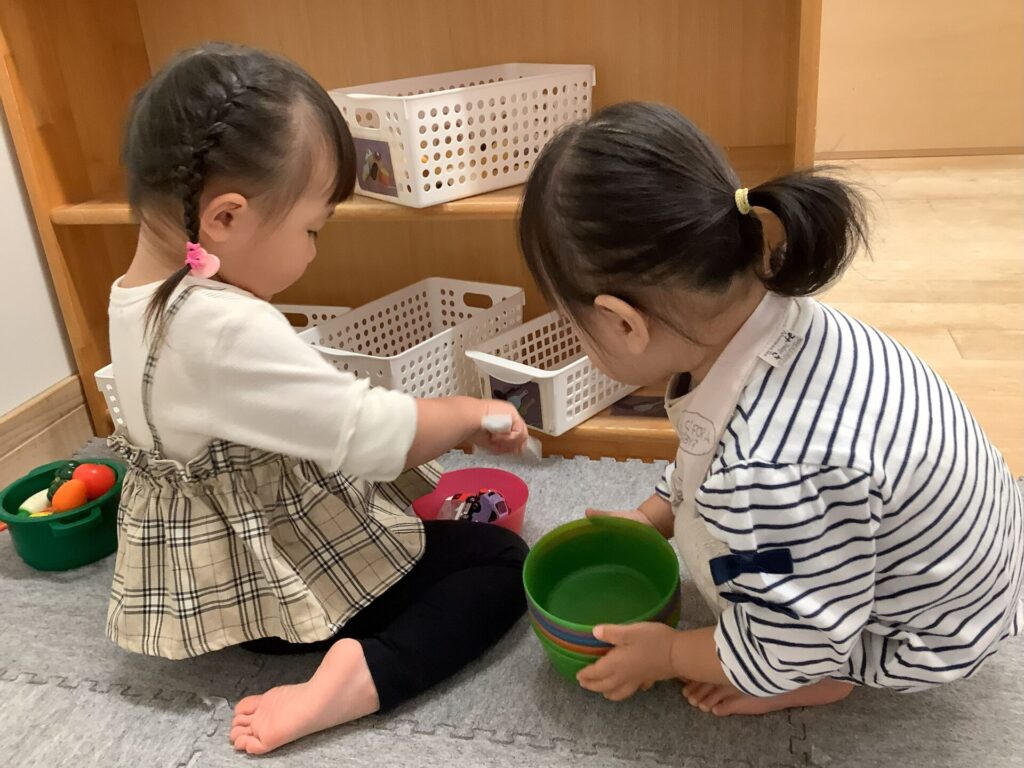 おままごとではお皿に上手に盛り付けて、お友だち同士で食べる真似をして遊んでいます。お店屋さんごっこをすると「お野菜スープでーす!」と店員さんになりきっていました♡ お友だちとおててを繋いで仲良しこよしなひばり組さんでした(*^^*)