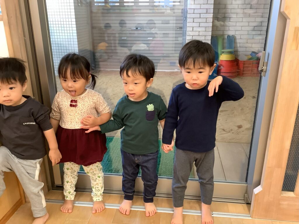 ひばり組さんはお着替えや靴の着脱など、身の回りのことが自分でできるように練習しています。自分でやってみようと手に取り、力を入れて引っ張ったり、思うようにできずに悔しくなりながらも日々頑張っています☆