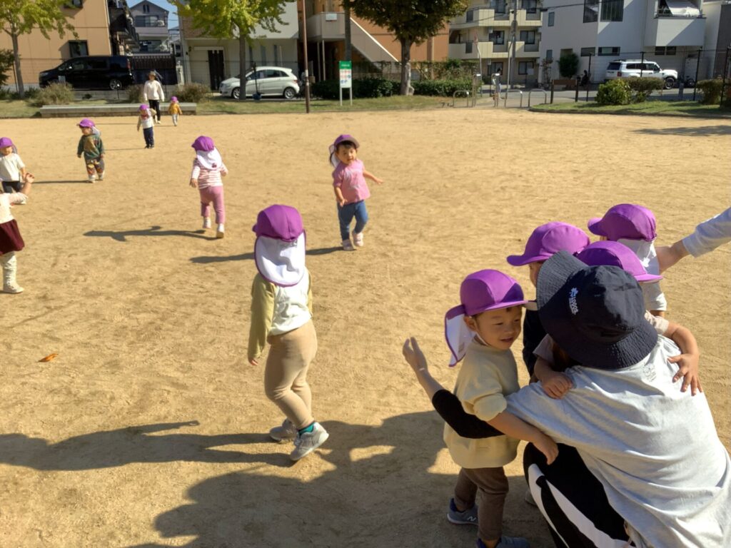 過ごしやすい気温になり、公園へ遊びに行くことも増えました。かけっこをして先生達を追いかけたり、葉っぱやどんぐりなど季節の植物にも触れました。
