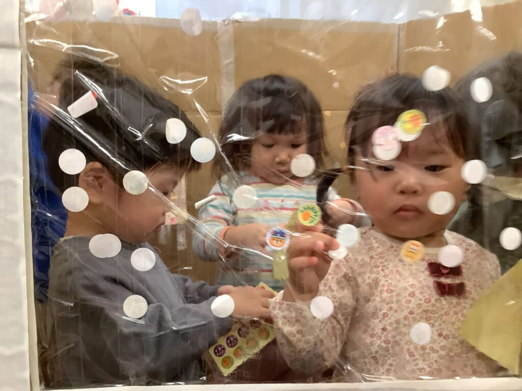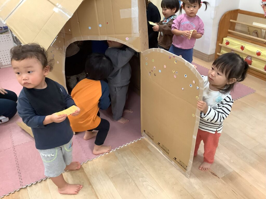 室内ではダンボールハウスで遊びました。周りにシールを貼りオリジナルのハウスが完成しました☆扉をしめて隠れたり、窓からお友だちをのぞいて「キャー」と楽しそうなお声が聞こえていました♪