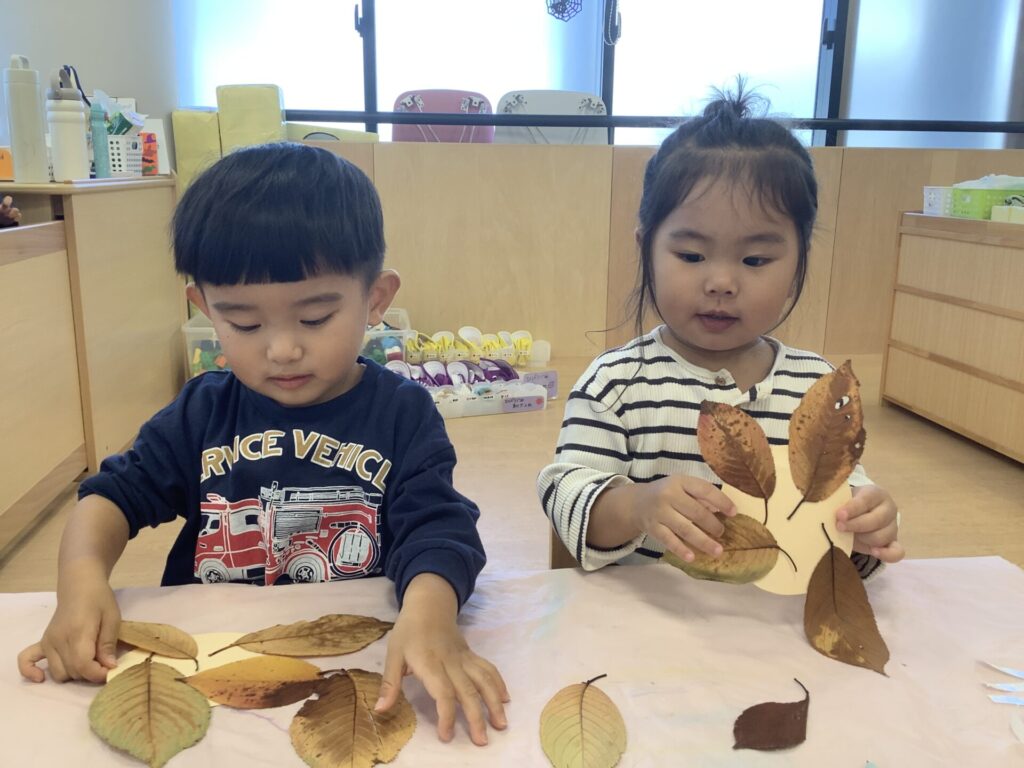 10月に入り、涼しくなってきたので公園でおもいきり体を動かしたり、手作りのお散歩バッグを持って落ち葉やどんぐりを集めたりと、秋の自然を感じながらのびのびと遊ぶ姿が見られました!10月の製作はみんなで集めた落ち葉を使いました🍂