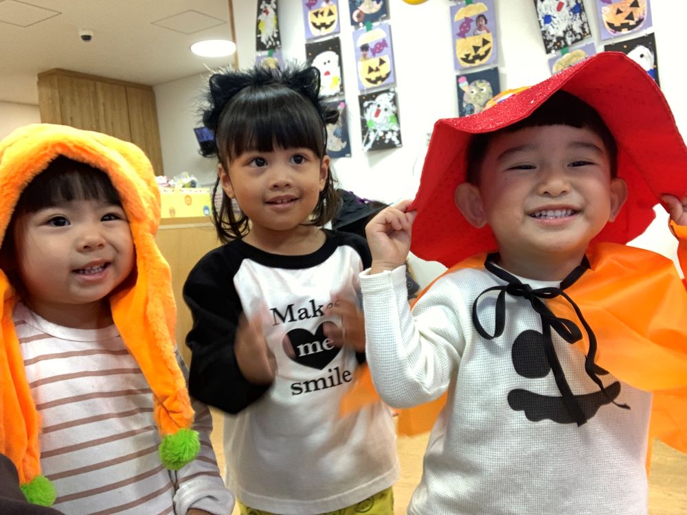 ハロウィンパーティーでは、かわいいカチューシャや帽子をつけて友達や保育士と一緒に色々なゲームを楽しみ、最後にはお菓子をもらってにっこり笑顔の子どもたちでした✨