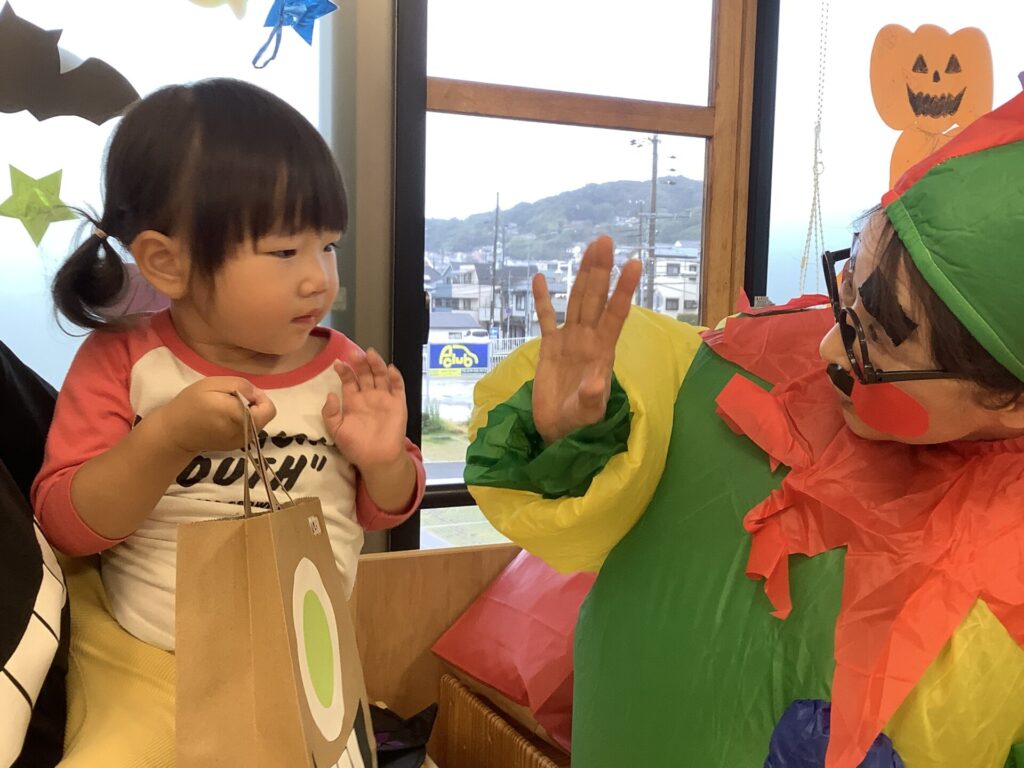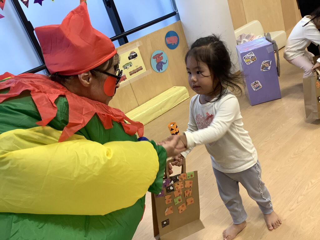 ゲームの後は、「トリックオアトリート!」とピエロに変身した先生からお菓子をもらいました♪